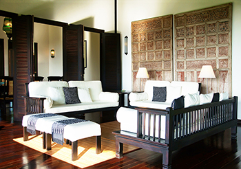 De gelijkvloerse Balinese vakantievilla heeft een woonoppervlakte van ruim 300 m². Zij is voorzien van houten vloeren en bamboe zonneschermen. In de open woonkamer heeft u zicht op het hoge, originele alang-alang dak. Er staan drie brede zit- en loungebanken, antieke leunstoelen, terrazzo tafels, originele Batavia stoelen en antieke Javaanse poortdeuren. Die meubels geven de luxe vakantiewoning een koloniale sfeer.